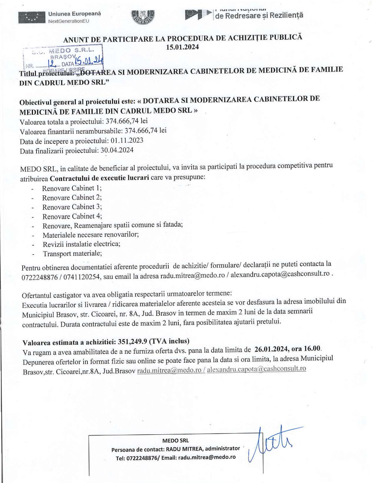 Publicul interesat poate inainta comentarii/observatii la proiectul deciziei de incadrare in termen de 5 de zile de la data publicarii prezentului anuntului.”