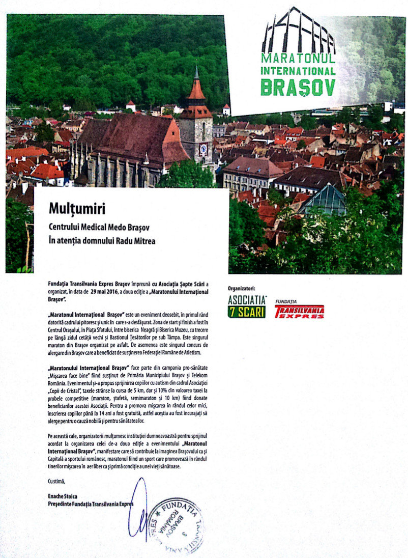 Pe aceasta cale, organizatorii mulțumesc instituției dumneavoastră pentru sprijinul acordat la organizarea celei de-a doua ediție a evenimentului „Maratonului Internațional Brașov”, manifestarea care să contribuie la imaginea Brașovului ca și Capitală a sportului românesc, maratonul fiind un sport care promoveaza în rândul tinerilor mișcarea în aer liber ca și primă condiție a unei vieți sănătoase.